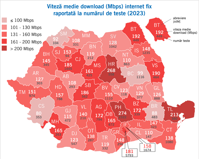 Pentru anul 2023, la nivel național, în rândul celor cinci5 furnizori ficși, viteza medie de download pentru conexiunile de internet fix a înregistrat valori diferite de la un județ la altul, între 80 Mbps în Caraș-Severin (în creștere față de valoarea minimă de 71 Mbps, înregistrată în Mehedinți în anul 2022) și 274 Mbps în Prahova (în scădere față de valoarea maximă de 280 Mbps, înregistrată în Harghita în anul 2022).
