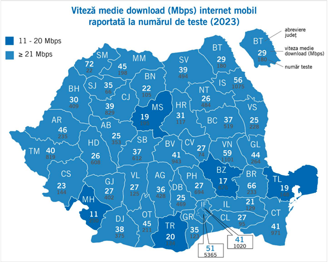 Pentru conexiunile de internet mobil, viteza medie de download a înregistrat valori cuprinse între 11 Mbps (Mehedinți) și 72 Mbps (Satu-Mare), în creștere față de valorile limită obținute în 2022 (9 Mbps – valoarea minimă înregistrată tot în Mehedinți și 68 Mbps – valoarea maximă înregistrată în București la nivelul anului 2022).